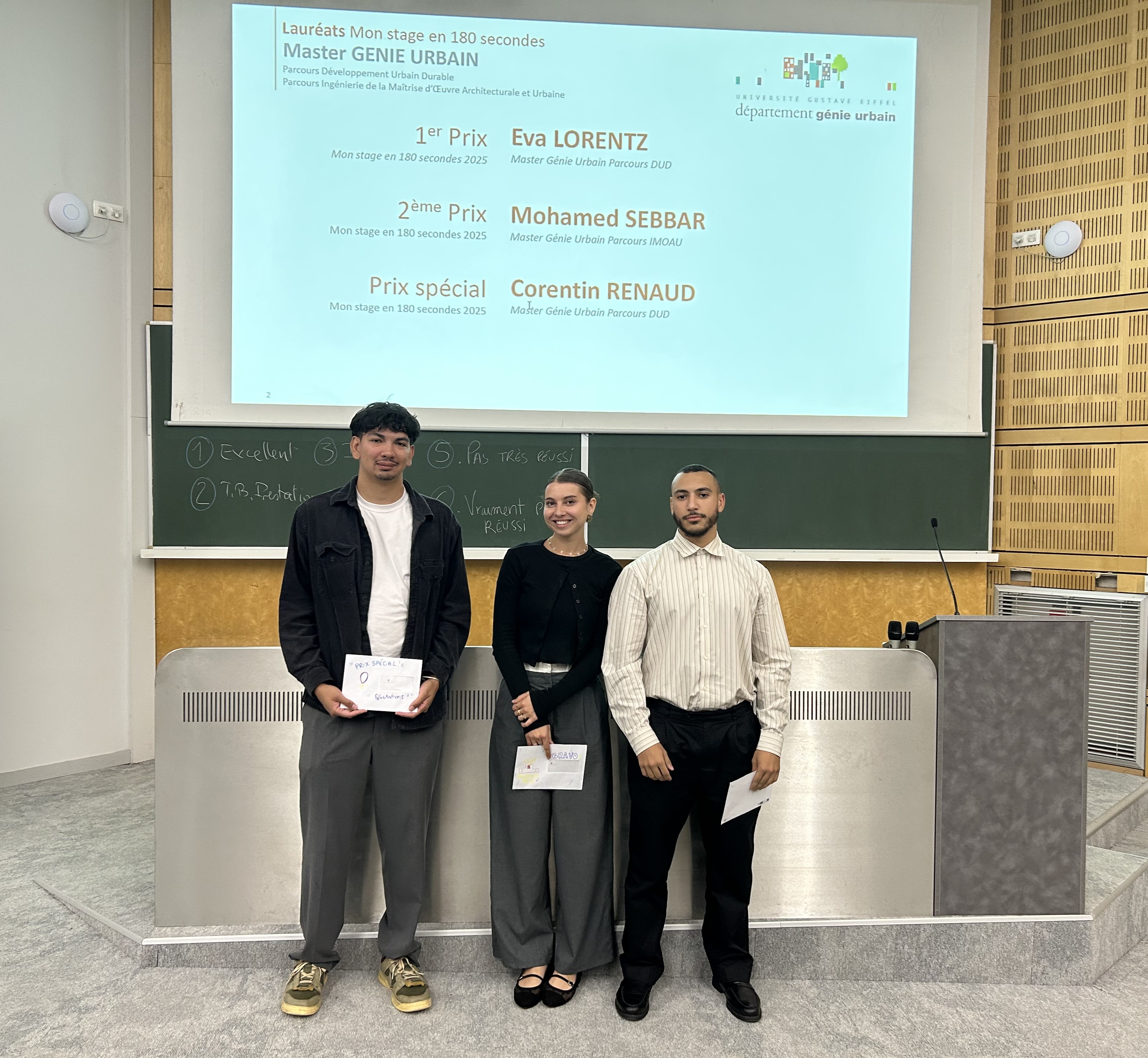 Cette année encore, les étudiant·es du Master génie urbain, parcours Développement Urbain Durable (DUD) et Ingénierie de la Maîtrise d’Œuvre Architecturale et Urbaine (IMOAU) ont relevé le défi de présenter leur expérience de stage ou d’alternance… en seulement 180 secondes !